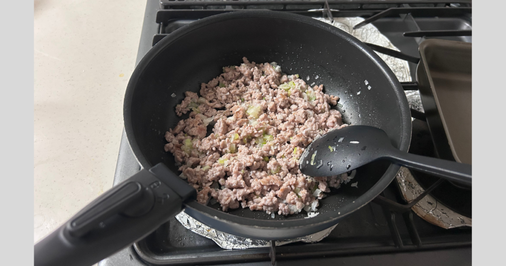 ひき肉とネギを炒め中。多めに作ってチャーハンや麻婆豆腐に使います。