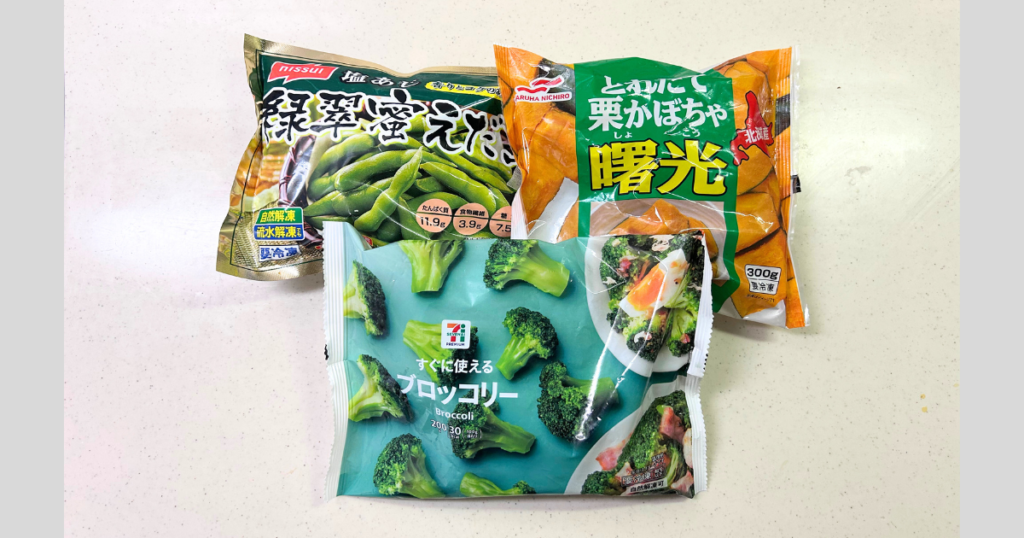 全ての野菜を自分で切って冷凍するのは疲れてしまうので、スーパーの冷凍野菜もフル活用しています。