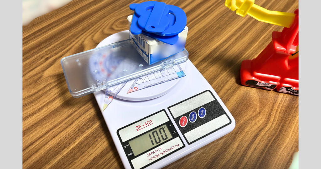NHKの『ピタゴラスイッチ』の『100グラムにちょうせん』を食い入るように見ていたので、大喜びで絵本やブロックを乗せていました。重さと数を関連づけて理解する原体験は、ここから始まりました。